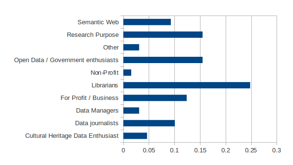 One of four OpenRefine user identified himself as librarians making this group the the largest of OpenRefine user base. The Researcher and Open Data enthusiasts represent the two second largest group, each representing over 15% of the userbase. Finally Data journalist and Semantic web each represent around 10%.