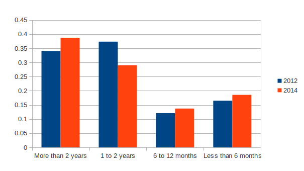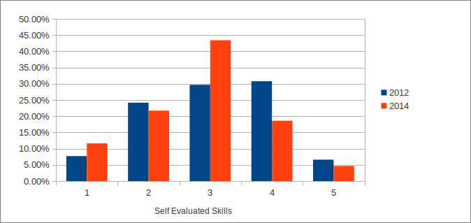 2012 picture is a bit harder to read with because the rating 3/5 is not as prominent as in 2014. However we can see the same trend with the increase of skilled user over time.