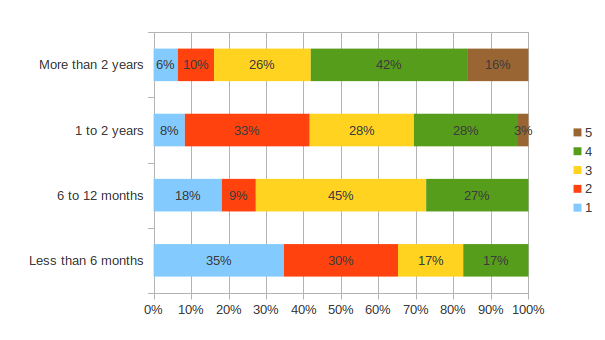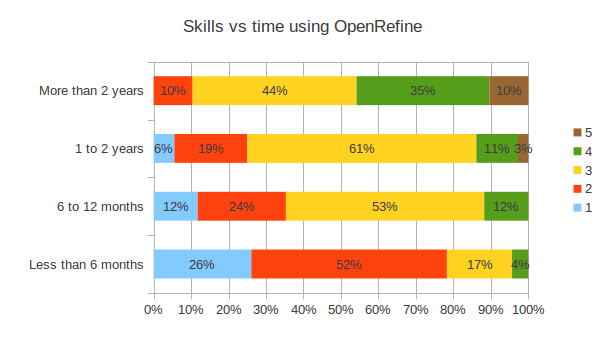 At a high level, the more experienced user are the higher they will rate their skill. It takes between 6 months for user to take advantages of OpenRefine. This is only after this time period that user move their skills from a 2/5 to a 3/5. After two years of usage no user rate his skills 1/5.