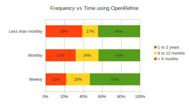 User over two years of experience tends to use it more often but there is no correlation between how long the user has been using OpenRefine and the frequency of usage. As we have seen previously, about 47% of them use it weekly, a third monthly and between 20% and a third less than monthly.