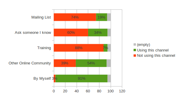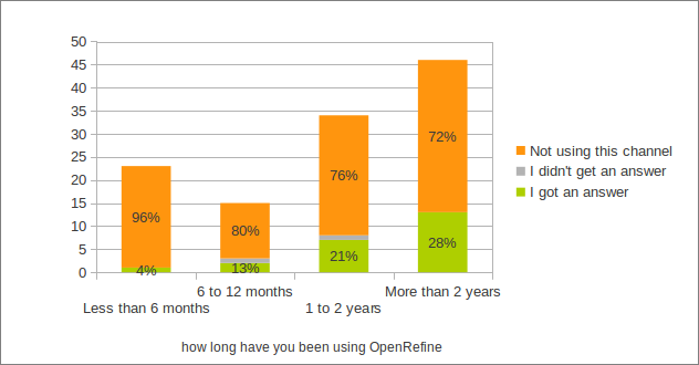 We can notice that only 19% of the user are reaching out through the mailing list which is supposed to be main media of communication for the community. When we drill down on who is using the mailing list we realized that this is mainly user with over a year of experience that are using this media. The graphic below show the percentage of user using the mailing list broke down by how long they have been using OpenRefine.