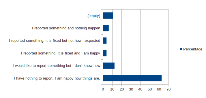 Close to 63% of the user are happy with OpenRefine and have nothing to report. However 11% of them want to report something but don't know how. Two hypotheses can be explore: