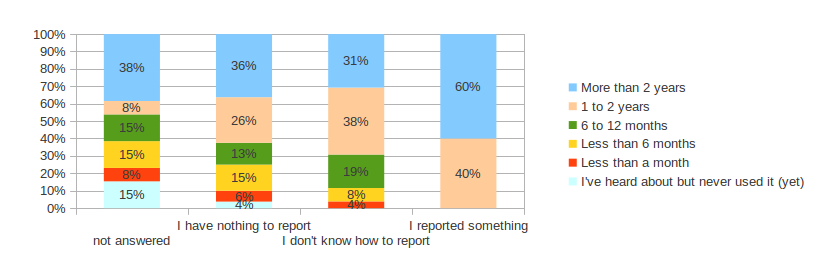 The following graphic shows that only user with over one year experiences with OpenRefine have reported bug or request new feature. Surprisingly over 60% of the user don't know to report something have been using Refine for over a year.
