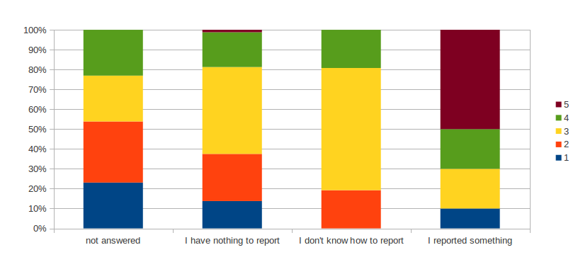 The following graphic shows that the ability to report is not linked with the skills level since user with a skill level of 4 doesn't know how to report. It is interesting that nearly all user self evaluated at 5 did report bug or request feature.